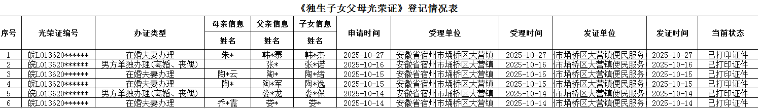 【办理结果】行政确认:大营镇2025年10月份独生子女光荣证发放名单
