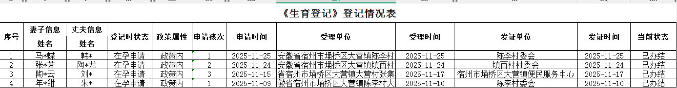 【办理结果】行政确认:大营镇2025年11月生育登记花名册