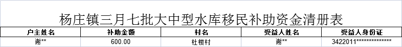杨庄镇三月七批大中型水库移民补助资金清册表