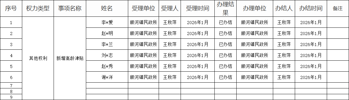 【办理结果】顺河镇2026年1月份权力事项办件结果表