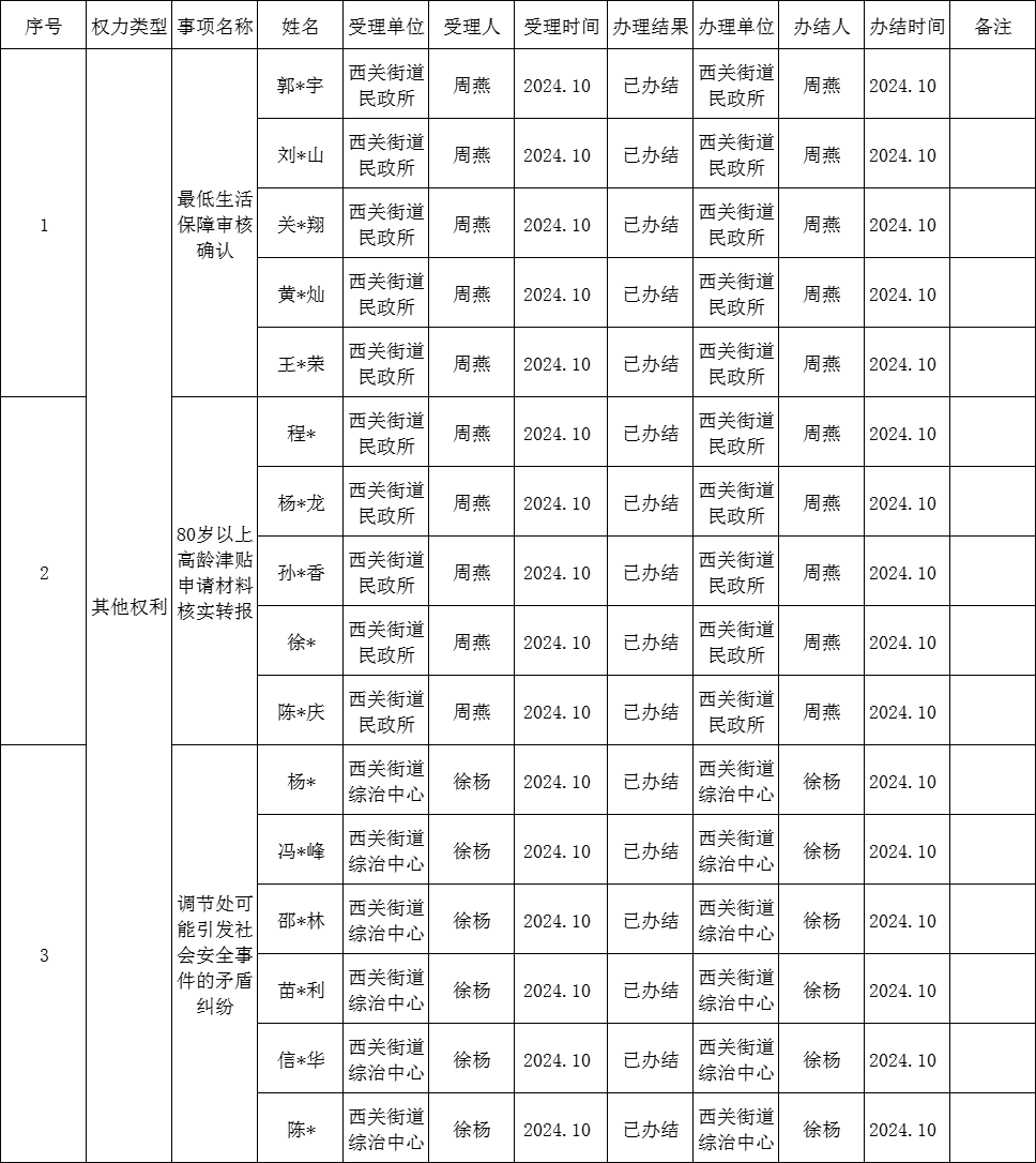 其他权力:西关街道2024年10月权责清单办理结果