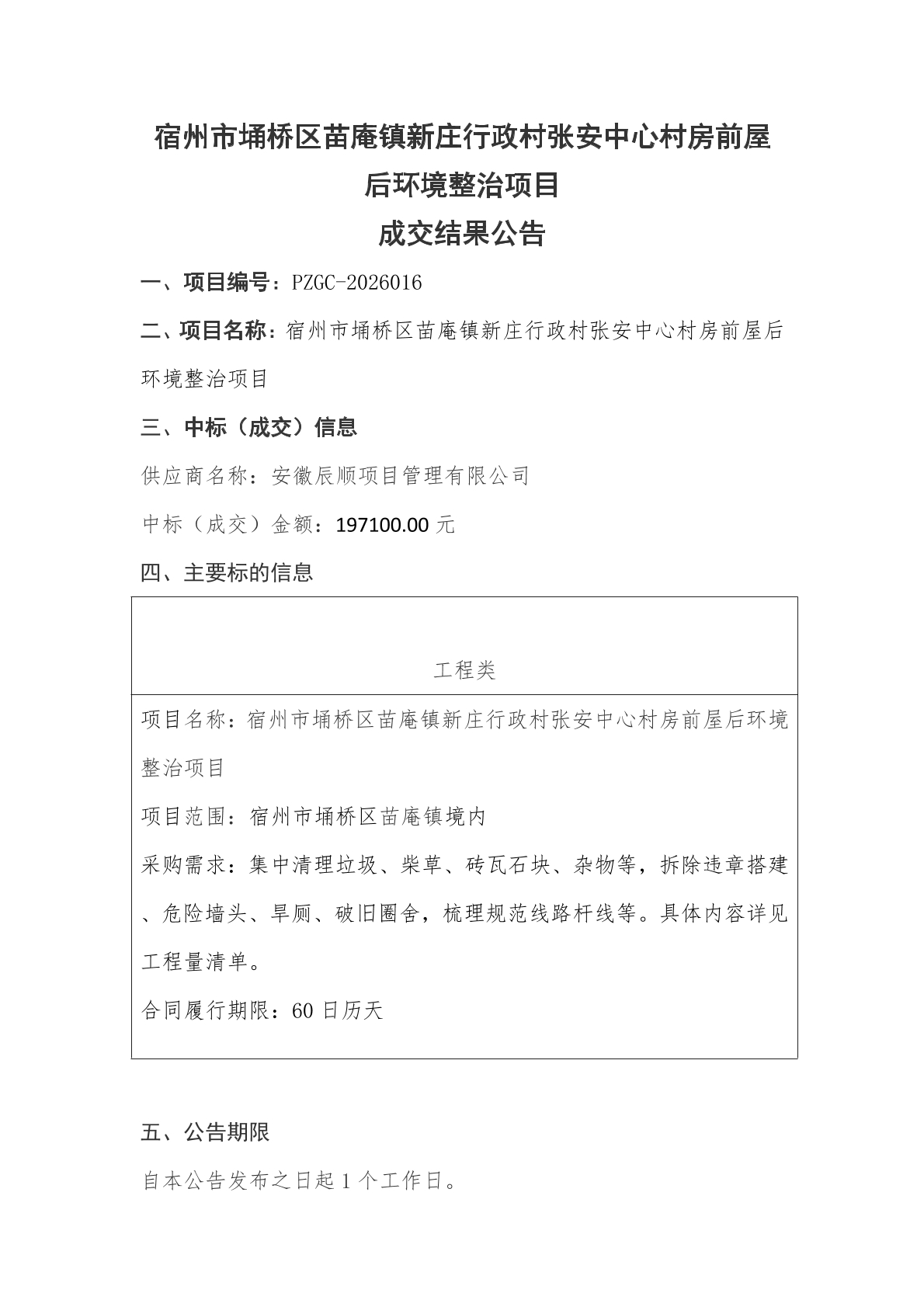 宿州市埇桥区苗庵镇新庄行政村张安中心村房前屋后环境整治项目成交结果公告