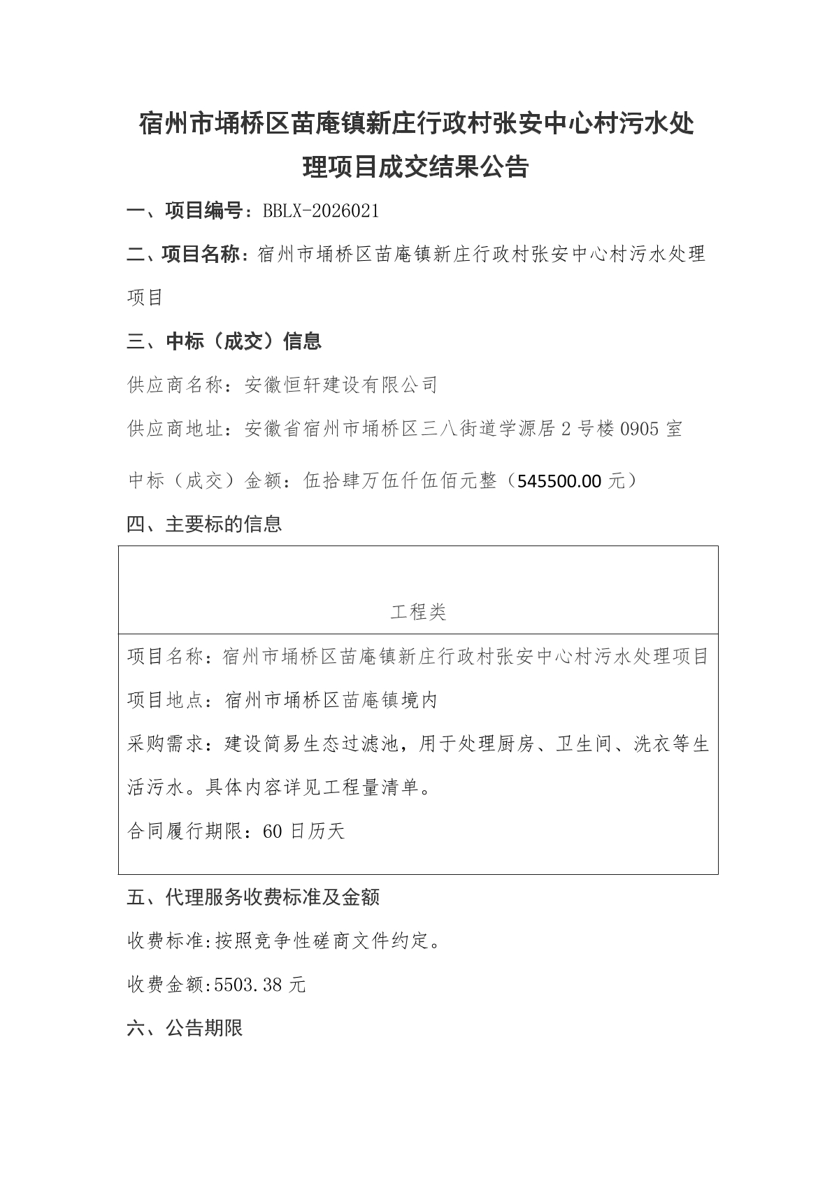 宿州市埇桥区苗庵镇新庄行政村张安中心村污水处理项目成交结果公告