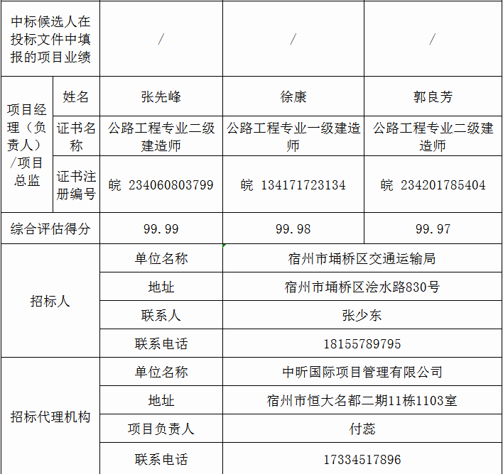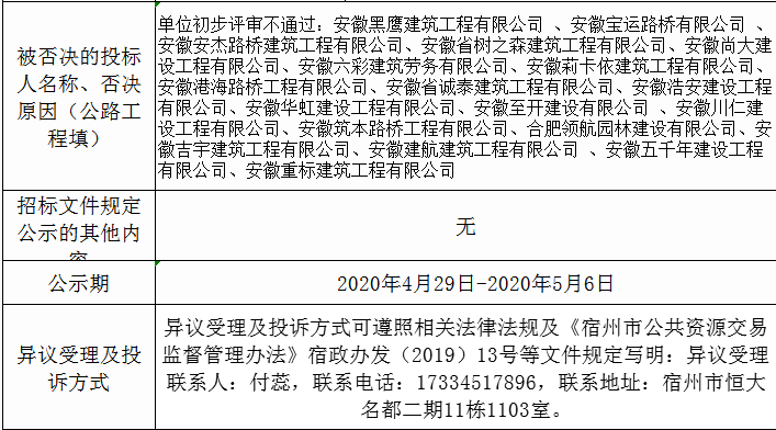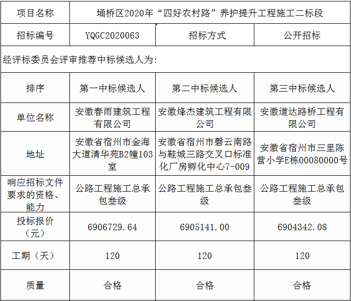 埇桥区2020年四好农村路养护提升工程施工二标段中标候选人公示