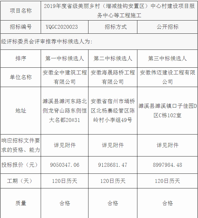 2019年度省级美丽乡村(增减挂钩安置区)中心村建设项目服务中心等工程施工中标候选人公示