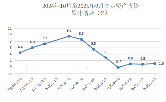 2024年10月至2025年9月固定资产投资累计增速(%)