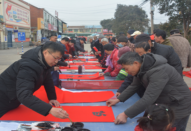 活动现场红纸铺展、墨香四溢,镇内书法爱好者与特邀书法家齐聚一堂,挥毫泼墨、笔走龙蛇。一副副饱含马年吉祥寓意、贴近乡村生活的春联跃然纸上,“一马当先开新局,福满永安庆丰年”“家和业兴迎盛世,春到人间万象新”等佳句,既有对新年的美好祈愿,也有传递着乡村振兴的昂扬气象。村民们有序排队、精心挑选,或现场“点题”定制专属对联,欢声笑语不断,年味十足。志愿者们热情协助铺纸、晾墨、分发,将一幅幅春联与“福”字送到群众手中,温暖直抵人心。