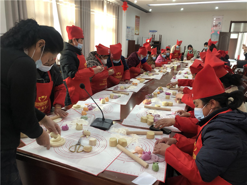 来自宿州皖嫂家政服务有限公司的面点师手把手教大家制作豆面灯和花样面点。小小的面团在老师的手里一剪一捏,瞬间变成憨态可掬的猪、伶俐可爱的兔、活灵活现的龙……各种属相栩栩如生,大家看得津津有味,连连称赞,纷纷跟着老师学习制作起来,大家把美好的愿望寄托在这小小的豆面灯里,祝福新的一年风调雨顺、福寿安康。