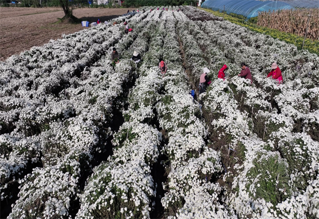 “带露水的菊花才能锁住香气。”种植大户王银朝站在田埂上,目光扫过忙碌的花田。他的手机不断响起,都是询问今日鲜花到货时间的客户。这片种植了八年的菊田,早已摸索出一套精准的时令法则——采摘必须在上午十点前完成,随后立即送往加工车间。
