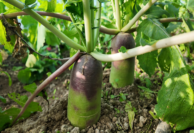 与普通萝卜相比,这种萝卜外皮色彩丰富,从缨子处的紫色渐变为翠绿,再到雪白,像层层递进的冰淇淋。切开后,肉质白里透红,口感甜而不辣,因其糖分含量充足,故得名“三色冰淇淋”萝卜。