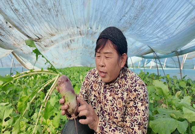 在沈家村,黄爱英家庭农场占地面积约200亩,其中蔬菜大棚150亩。根据季节的变化,这里不仅种植水果萝卜,还种植无花果、花菜、生菜等多样化的果蔬。“去年种了20亩‘三色冰淇淋’萝卜,个大饱满,单个重量在一斤半左右,含有丰富的花青素,营养价值高,自10月底上市以来,品质和价格都相当不错,亩产约7000斤,深受消费者喜爱。”黄爱英告诉记者。